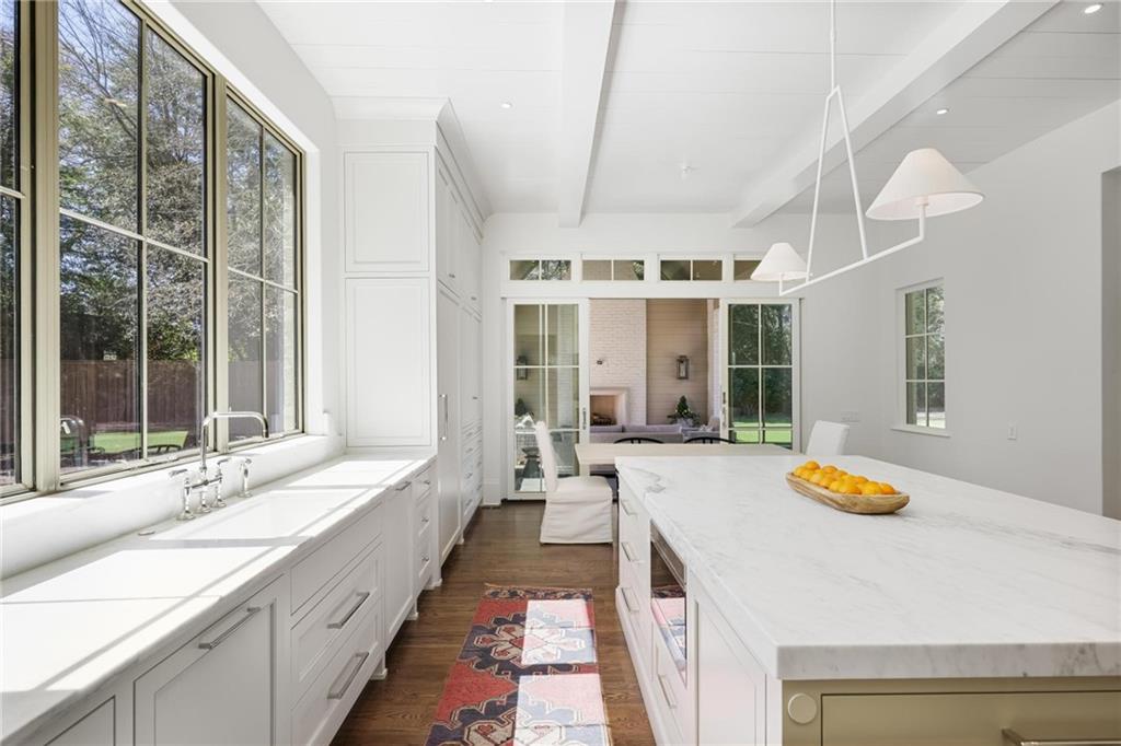 Located on sought-after Knollwood Drive, this exceptional residence embodies timeless elegance and modern luxury. Set against the picturesque backdrop of Tuxedo Park's signature rolling front lawns, a long driveway leads to this impeccably crafted custom home. Designed with a blend of sophistication and functionality by Harrison Design, the main level boasts an elegant entrance foyer that seamlessly flows into a formal dining room and a refined living room, complete with a grand fireplace. The state-of-the-art kitchen, featuring premium Sub-Zero and Wolf appliances, opens effortlessly to the inviting great room and a serene covered porch--perfect for indoor-outdoor living. A stunning scullery, wet bar and wine cellar, ideal for entertaining, further enhance the home's thoughtful design. The expansive primary suite on the main level is a true sanctuary, occupying its own private wing with a soaring vaulted ceiling. Dual walk-in closets and a lavish Arabescato marble bath-- featuring dual vanities, a spa-like soaking tub, and a separate shower--create a retreat of unparalleled luxury. A spacious office and a pretty paneled library with fireplace are also conveniently situated on the main level. There are two half baths and a large laundry room on the main level. Ascending the elegant staircase, the upper level reveals four bedrooms, each with its own marble en-suite bath, a secondary laundry room, and a versatile open flex space. One of the four bedrooms could also be used as upstairs primary bedroom. The finished terrace level is designed for both relaxation and recreation, offering an additional bedroom with a full bath, another half bath, a generous recreation room, and a private gym. This extraordinary home is the pinnacle of refined living, boasting a LARGE, WALK-OUT BACKYARD with stunning POOL, an outdoor kitchen with a built-in grill, an ELEVATOR servicing all three levels, abundant storage, and oversized FOUR-CAR GARAGE. A masterpiece of design and craftsmanship, this residence offers an unparalleled lifestyle in one of Atlanta's most prestigious neighborhoods.
